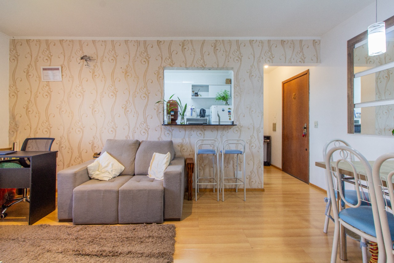Você vai se surpreender com esta apartamento! São 45m2 de área privativa! Reformado e "mobiliado"! Living 2 ambientes, amplo, em laminado tabuão, cozinha americana montada com área de serviço separada, dormitório espaçoso, com ar condicionado instlado, banheiro social com ventilação natural. Andar alto, arejado, com vista, sol predominante da tarde. Prédio bem cuidado, condominio enxuto, com bicicletário. Vaga de garagem condominial.